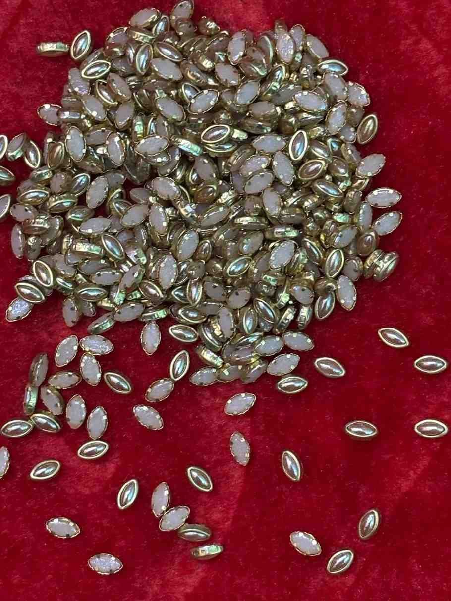 Introduce a sharp, artistic flair to your embroidery with Faizu Stores Ceramic Eye Kundans. These stones feature the classic “Marquise” or eye-shaped silhouette, finished with a smooth, opaque ceramic surface. This unique texture provides a sophisticated, matte-to-semi-gloss look that stands out beautifully against traditional shimmering threads. They are the preferred choice for artisans looking to create realistic floral petals, leaf patterns, and intricate “Peacock eye” motifs in Aari and Zardosi work.