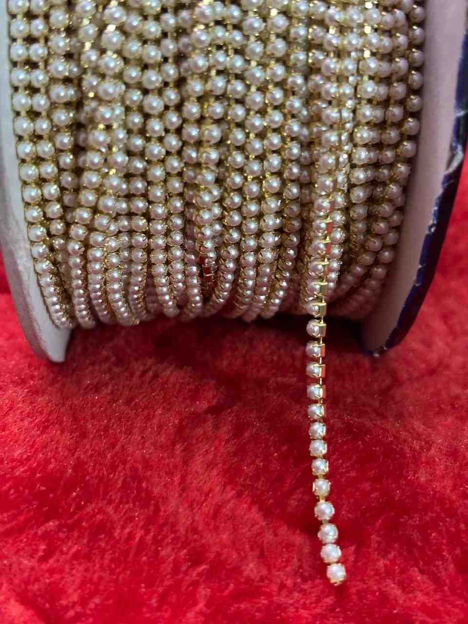 Elevate your bridal and couture designs with the classic grace of our Premium Pearl Chain. Featuring high-luster pearls securely linked in a flexible metallic setting, this chain offers a continuous, shimmering line of elegance. Perfect for outlining necklines, creating sophisticated borders, and adding a royal touch to Aari work, it is durable, lightweight, and Ready to Dispatch.